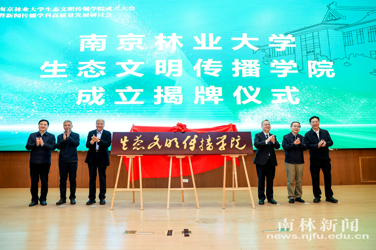 赵树丛、勇强、杨波、葛莱、周跃敏、曾祥谓共同为生态文明传播学院揭牌。会上还举行了捐赠仪式,勇强代表学校向捐赠单位代表致谢,并为南京宁卫医药集团有限公司、南京状元兔教育科技集团有限公司、江苏奇伟建设工程有限公司的代表颁发了捐赠证书。