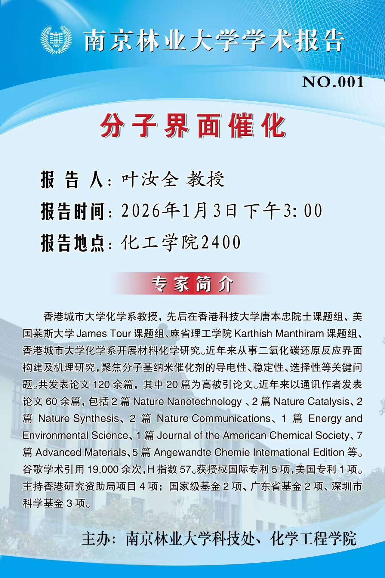 活动预告 首页 -活动预告 分子界面催化 来源:通讯员:摄影:【报告人】叶汝全 教授 【报告时间】2026年1月3日 下午3:00 【报告地点】化工院2400编辑:浏览:时间:2025-12-31 字号:【大中小】