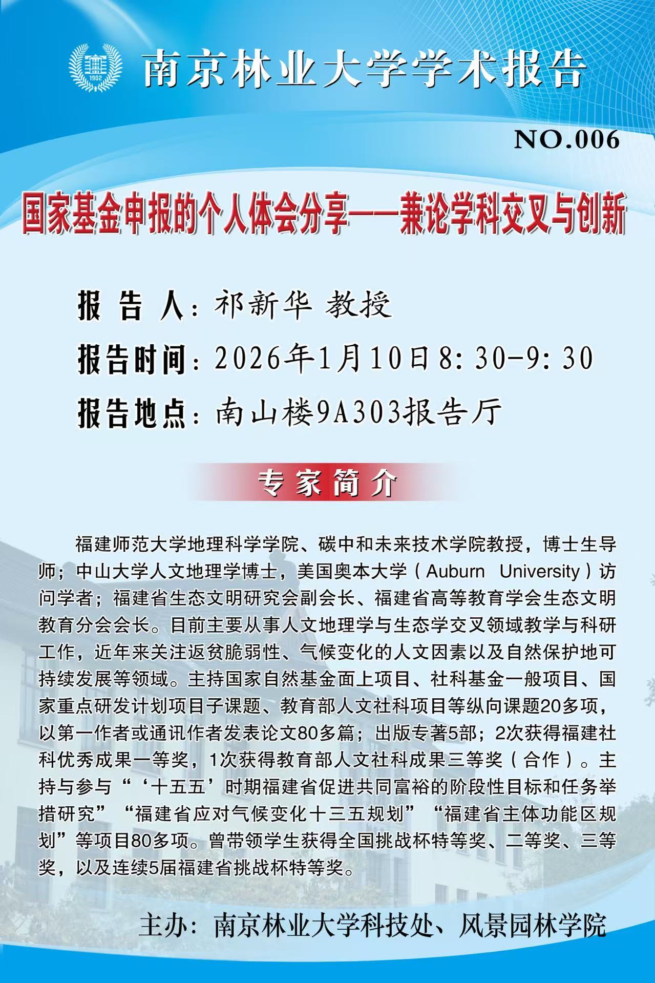 活动预告 首页 -活动预告 国家基金申报的个人体会分享--兼论学科交叉与创新 来源:通讯员:摄影:【报告人】 祁新华 教授 【报告时间】2026年1月10日8:30-9:30 【报告地点】南山楼9A303报告厅编辑:浏览:时间:2026-01-12 字号:【大中小】