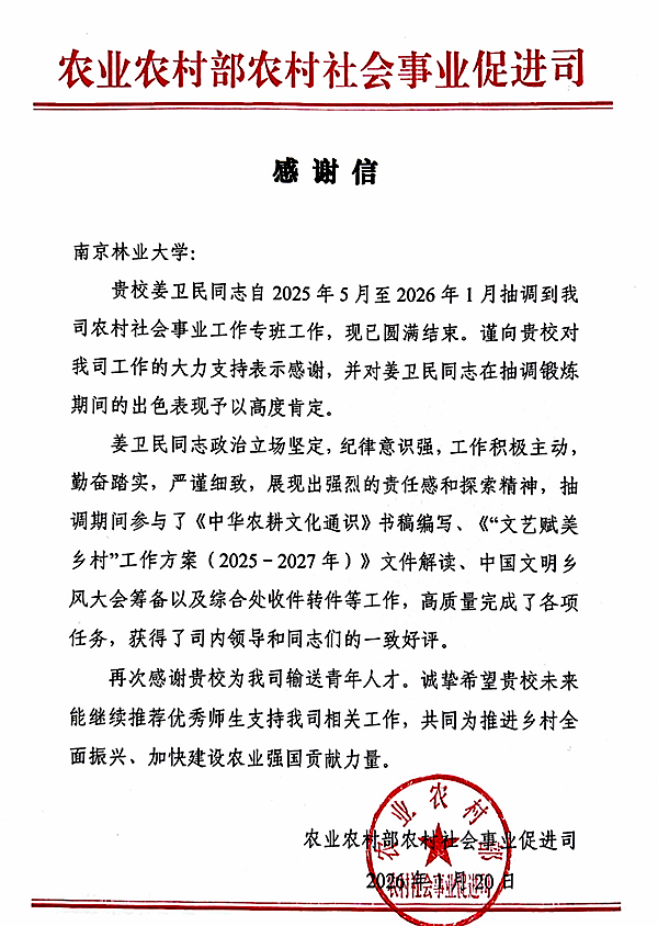 【精品一区二区三区四区中心讯】近日,我校收到农业农村部农村社会事业促进司发来感谢信,对由我校中国特色生态文明建设与林业发展研究院选派的姜卫民同志,在抽调工作期间展现的过硬政治素质、扎实专业能力和优良工作作风给予高度评价,并对学校的大力支持表示感谢。
